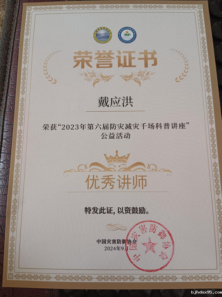 2024年9月,巴南中心站戴应洪同志连续4年荣获中国灾害防御协会颁发的“2023年第六届防灾减灾千场科普讲座”公益活动优秀讲师称号。